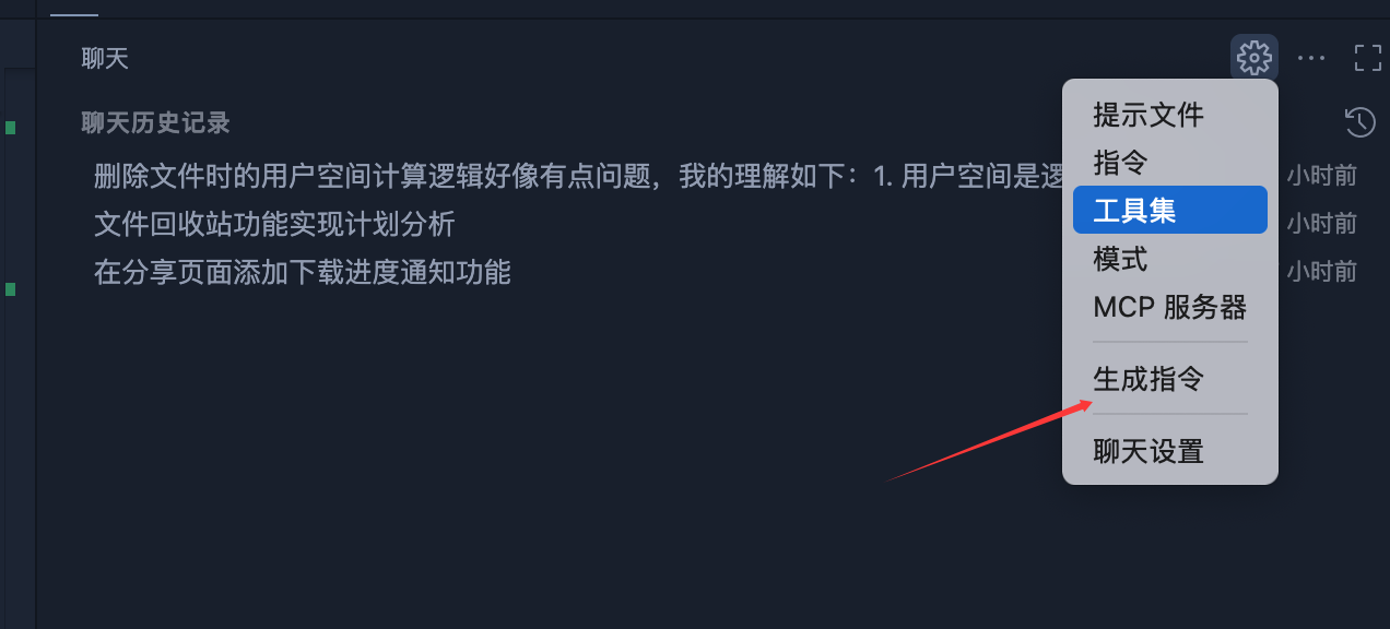 提供背景:我们需要提供给大模型我们项目的大概情况,如项目大概是干什么的、技术栈是什么、一些大概的功能交互是怎么样的、数据模型是怎么样的、开发方式是怎么样的,等等。这个一般是让AI生成一个提示文件,如Copilot的“生成指令”功能,生成的copilot-instructions.md。用户每次提问,编辑器都会自动带上此文件,让AI可以准确回答问题,并减少出错概率。